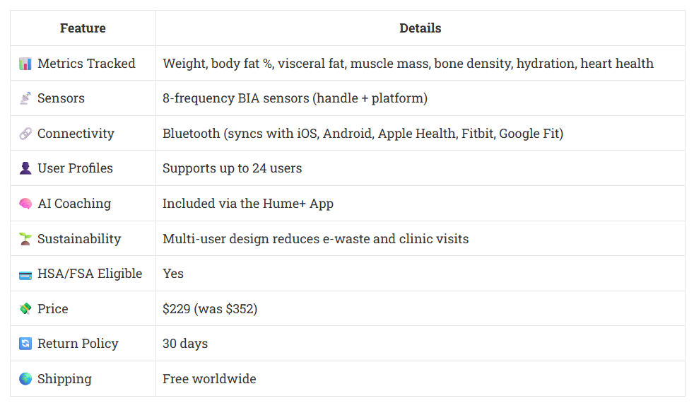 | 📊 Metrics Tracked | Weight, body fat %, visceral fat, muscle mass, bone density, hydration, heart health |
